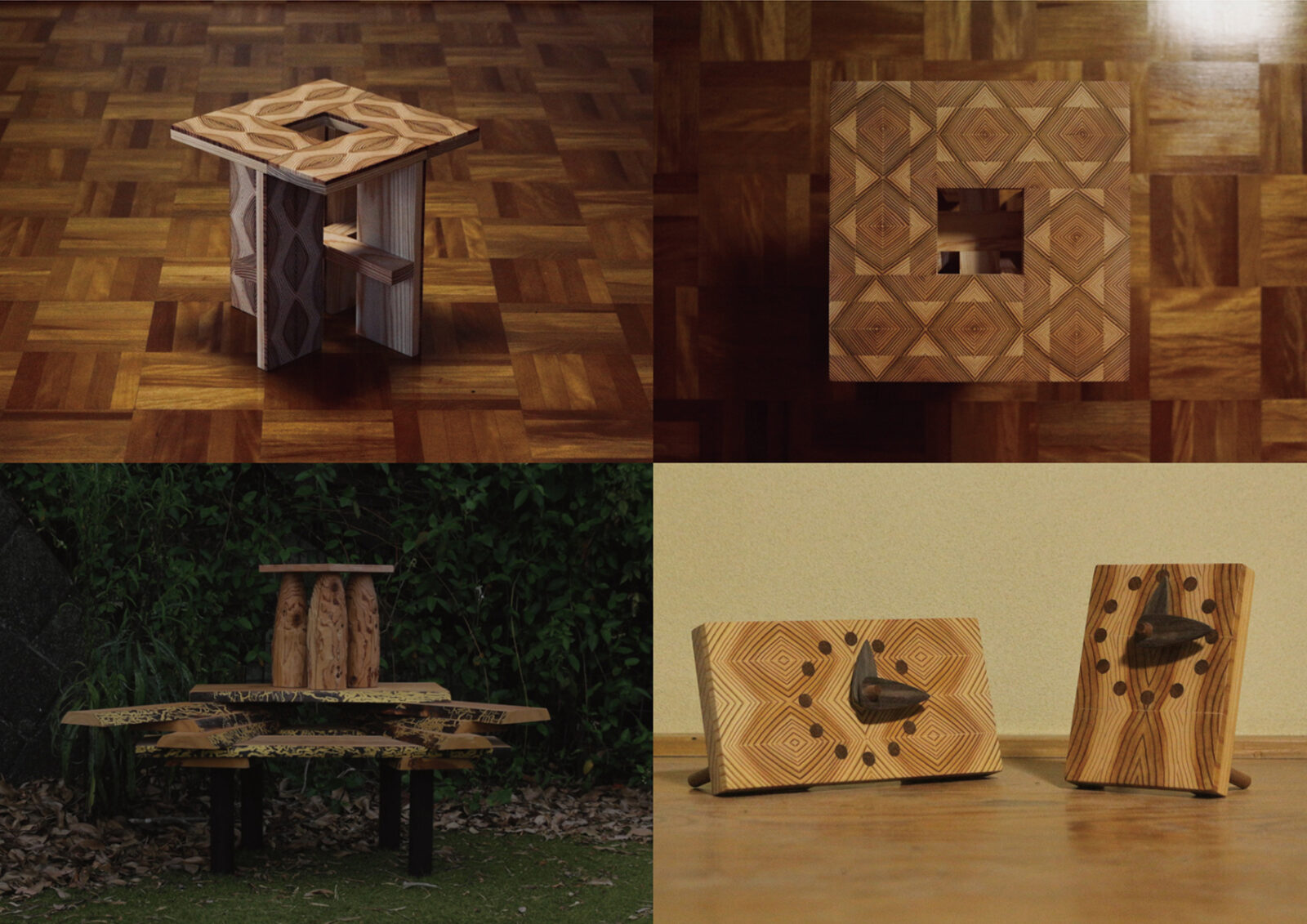 これまでは、クラゲのようなスツールや、何かに寄生されたような長椅子など、ユニークな作品を発表してきました。今回は、木の断面(木口)にフォーカスを当てた新たな表現に挑戦しています。