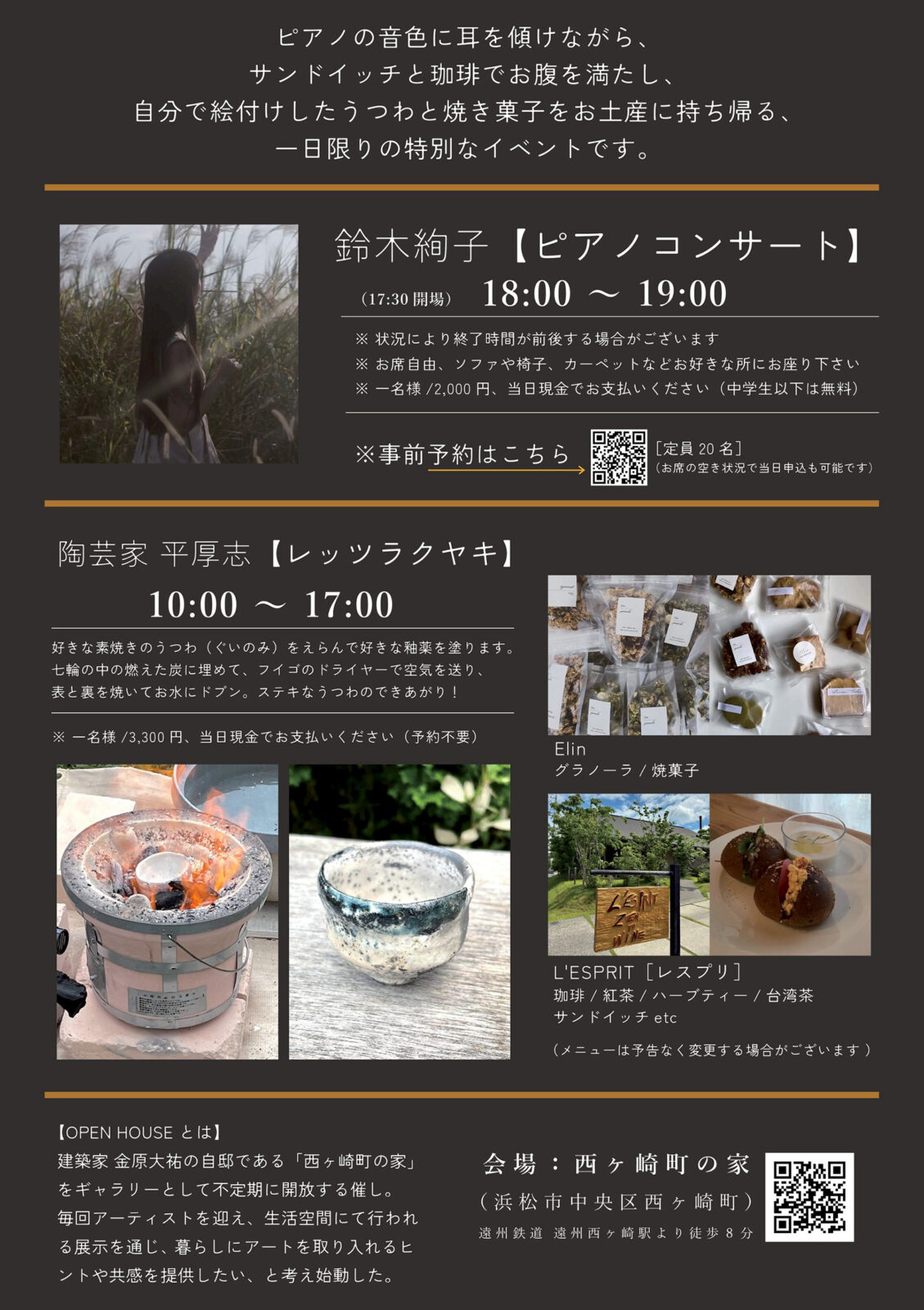 今回は、ピアノの音色に耳を傾けながら、サンドイッチと珈琲でお腹を満たし、自分で絵付けした器と焼き菓子をお土産に持ち帰る、一日限りの特別なイベントです。