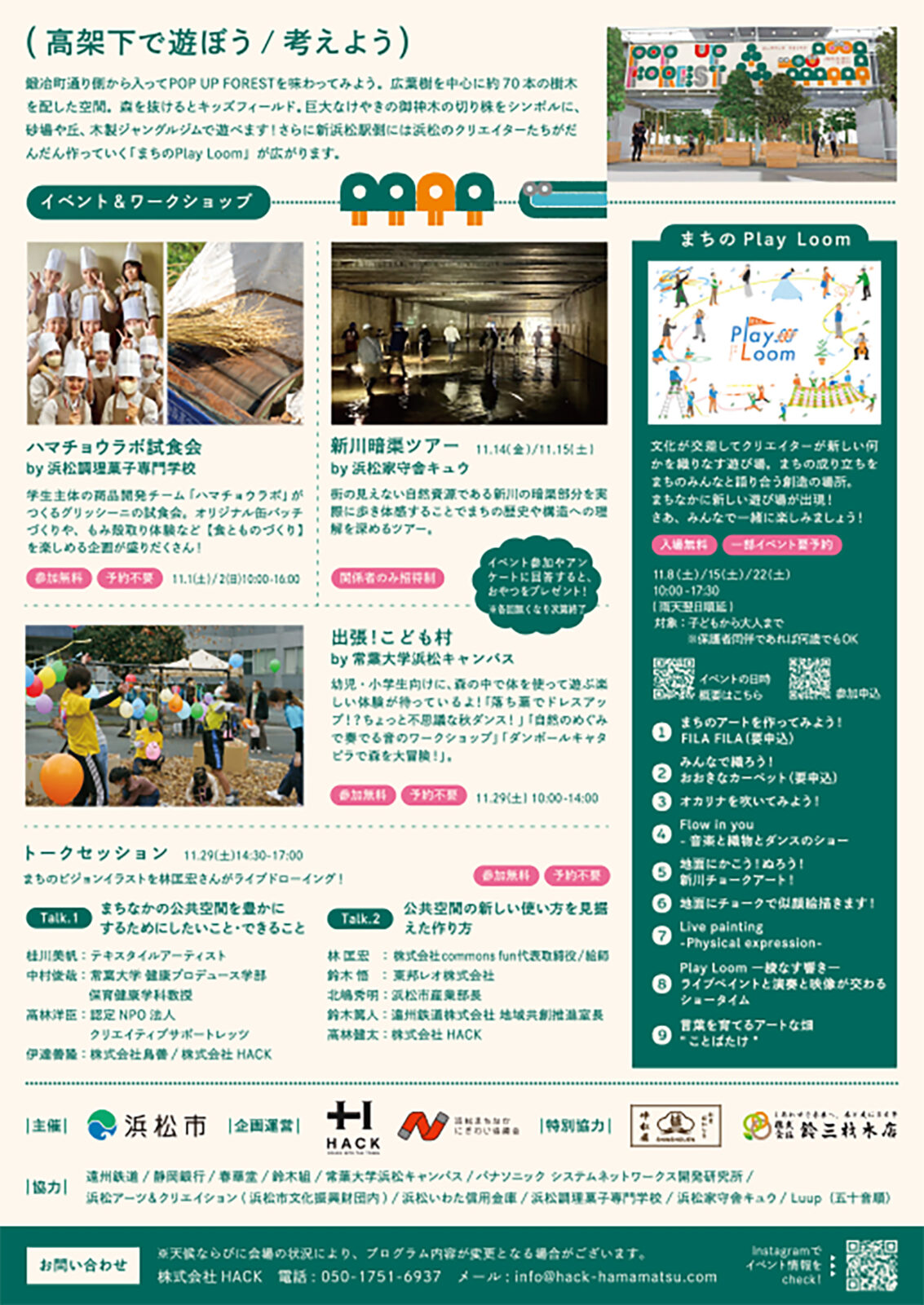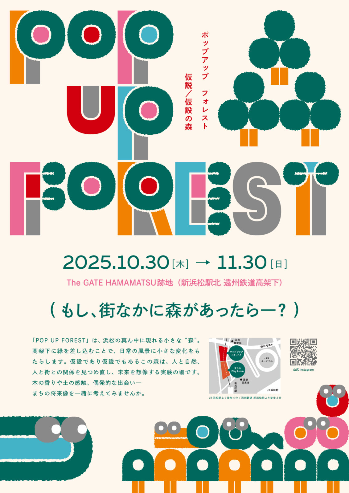 「POP UP FOREST」は、浜松の真ん中に現れる小さな“森”。高架下に緑を差し込むことで、日常の風景に小さな変化をもたらします。仮設であり仮説でもあるこの森は、人と自然、人と街との関係を見つめ直し、未来を想像する実験の場です。木の香りや土の感触、偶発的な出会いーーまちの将来像を一緒に考えてみませんか。