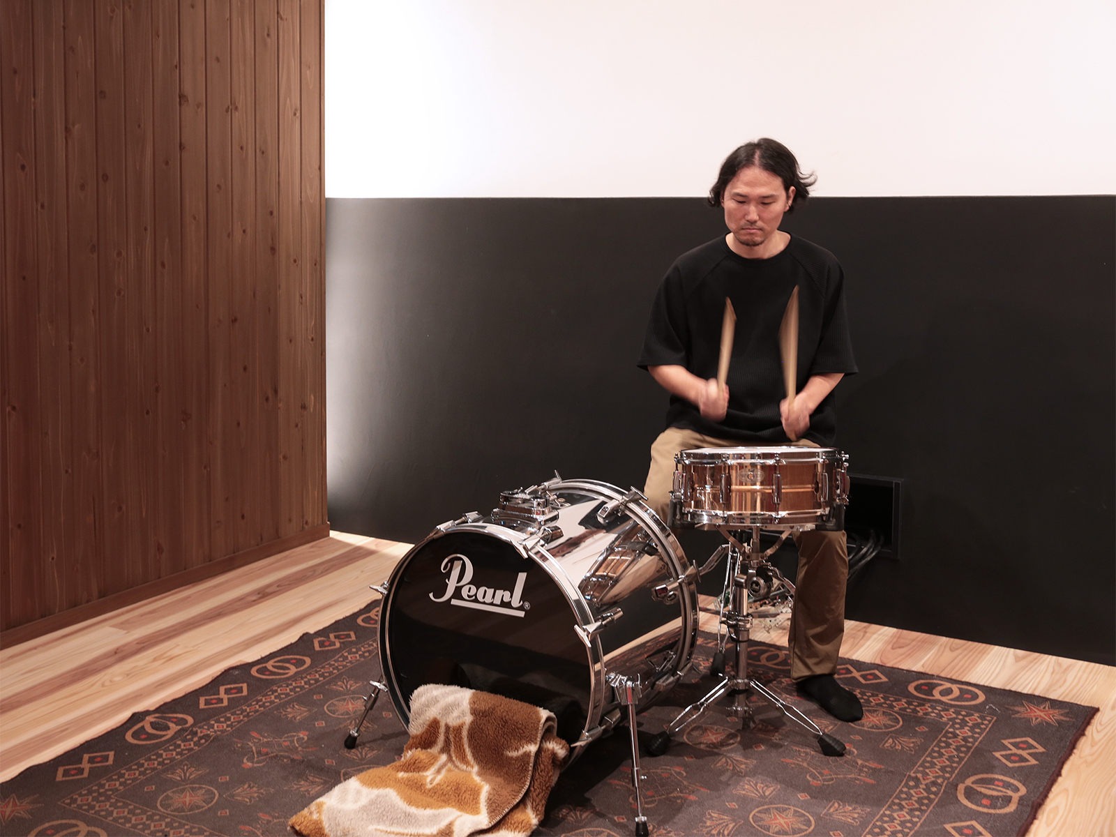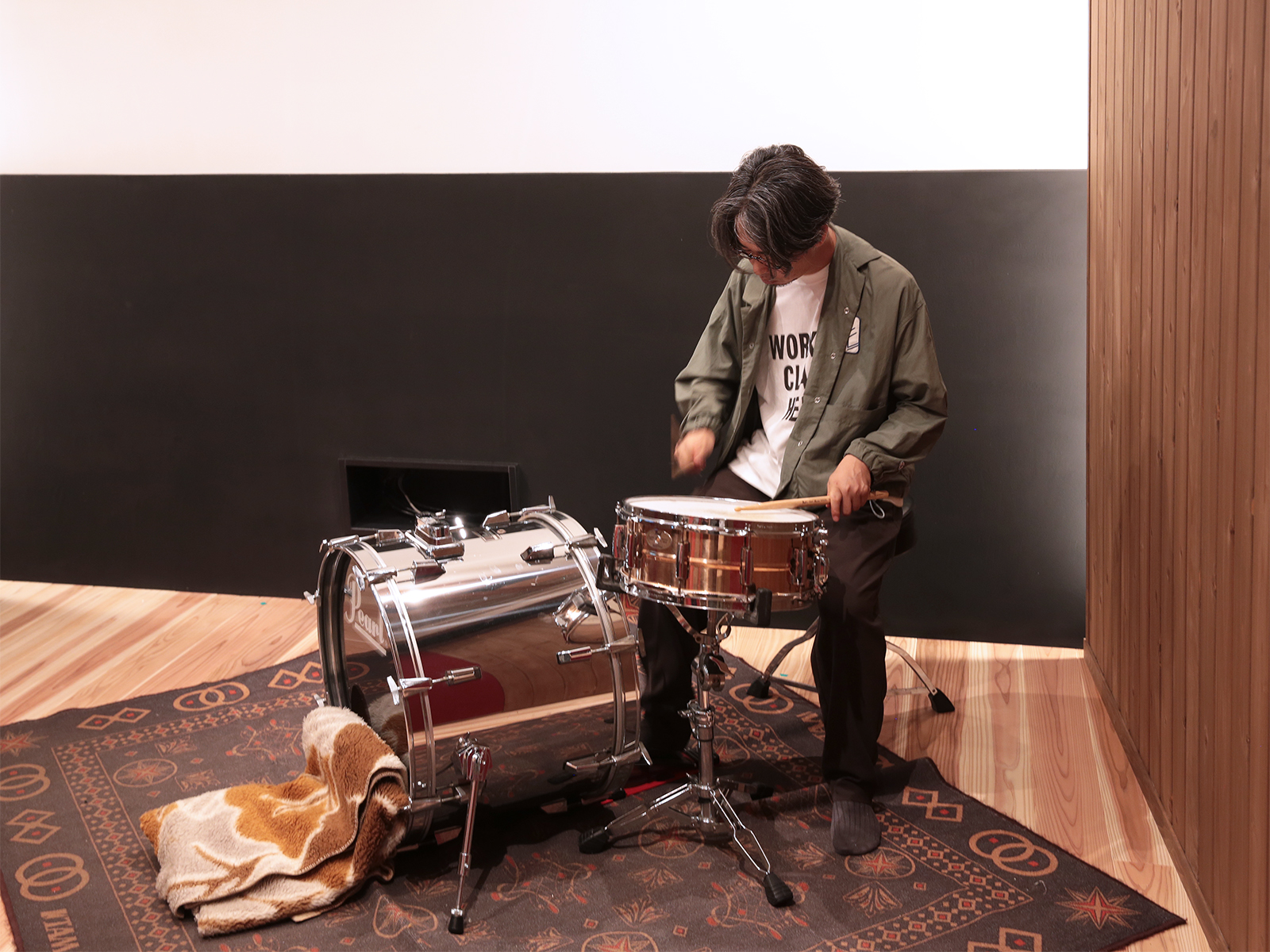 ドラムセットをスタジオに配置し、音響を確認。スタジオ外の環境から内部の状況により微妙に変わる音。チェックに余念がありません。